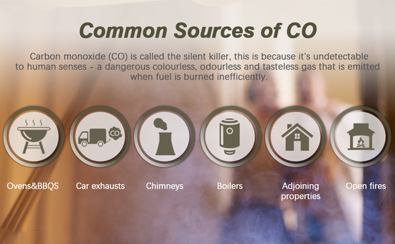 | 50-199ppm | अलार्म स्तर I, वास्तविक समय सीओ सांद्रता दिखाता है, लाल बत्ती एक बजर की आवाज़ के साथ चमकती है |