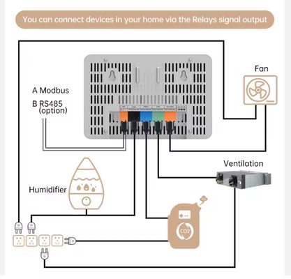 | सिंगल आउटपुट वायरिंग | CO2TVOC, PM2.5, और आर्द्रता सिग्नल आउटपुट के लिए RS485/रिले |