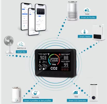 वाई-फ़ाई एयर क्वालिटी मीटर के साथ इनडोर वायु गुणवत्ता चुनौतियों से आगे रहें, जिसे वास्तविक समय के पर्यावरणीय निगरानी और स्मार्ट नियंत्रण एकीकरण के लिए डिज़ाइन किया गया है। यह उन्नत डिवाइस लगातार CO₂, PM2.5, PM1.0, TVOCs, तापमान और आर्द्रता को ट्रैक करता है, वाई-फ़ाई पर उच्च-सटीक डेटा प्रदान करता है और आपके स्मार्ट सिस्टम के साथ निर्बाध संचार को सक्षम बनाता है।